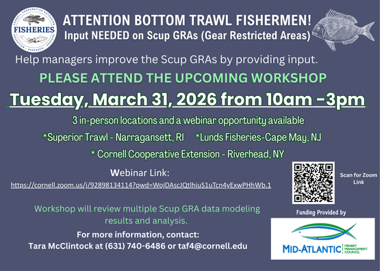 Cornell Cooperative Extension (CCE), in cooperation with the Mid-Atlantic Fishery Management Council, will hold a workshop to collect industry input on the current scup Gear Restricted Areas (GRAs). The Council and CCE are particularly seeking input from small mesh trawl fishermen. However, anyone with an interest in the scup GRAs is invited to attend.